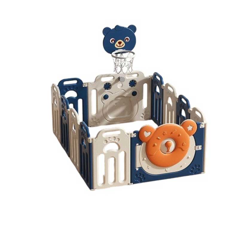 Сгъваемата бебешка ограда за игра с баскетболен кош и специален елемент - мече е чудесен подарък за всяко дете. Моделът е със здрава конструкция, обли ъгли на модулите и свеж дизайн. Изработена е от UV устойчива пластмаса, която предпазва цвета и здравината на материала при продължително излагане на слънце. Съдържа много активности, които ще усмихнат малчуганите и ще осигурят свободно време на родителите.